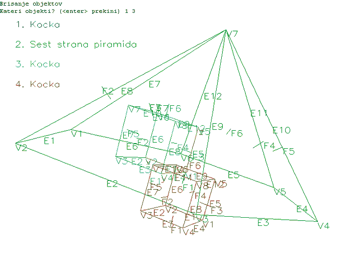 Za brisanje pritisnemo tipko 'D'. Na zaslonu se izpišejo vsi komentarji naloženih modelov. Program zahteva navedbo vseh modelov, ki jih želimo izbrisati. V tem primeru želim izbrisati modela št. 1 in 3. Po brisanju se pojavi na ekranu Slika 12.